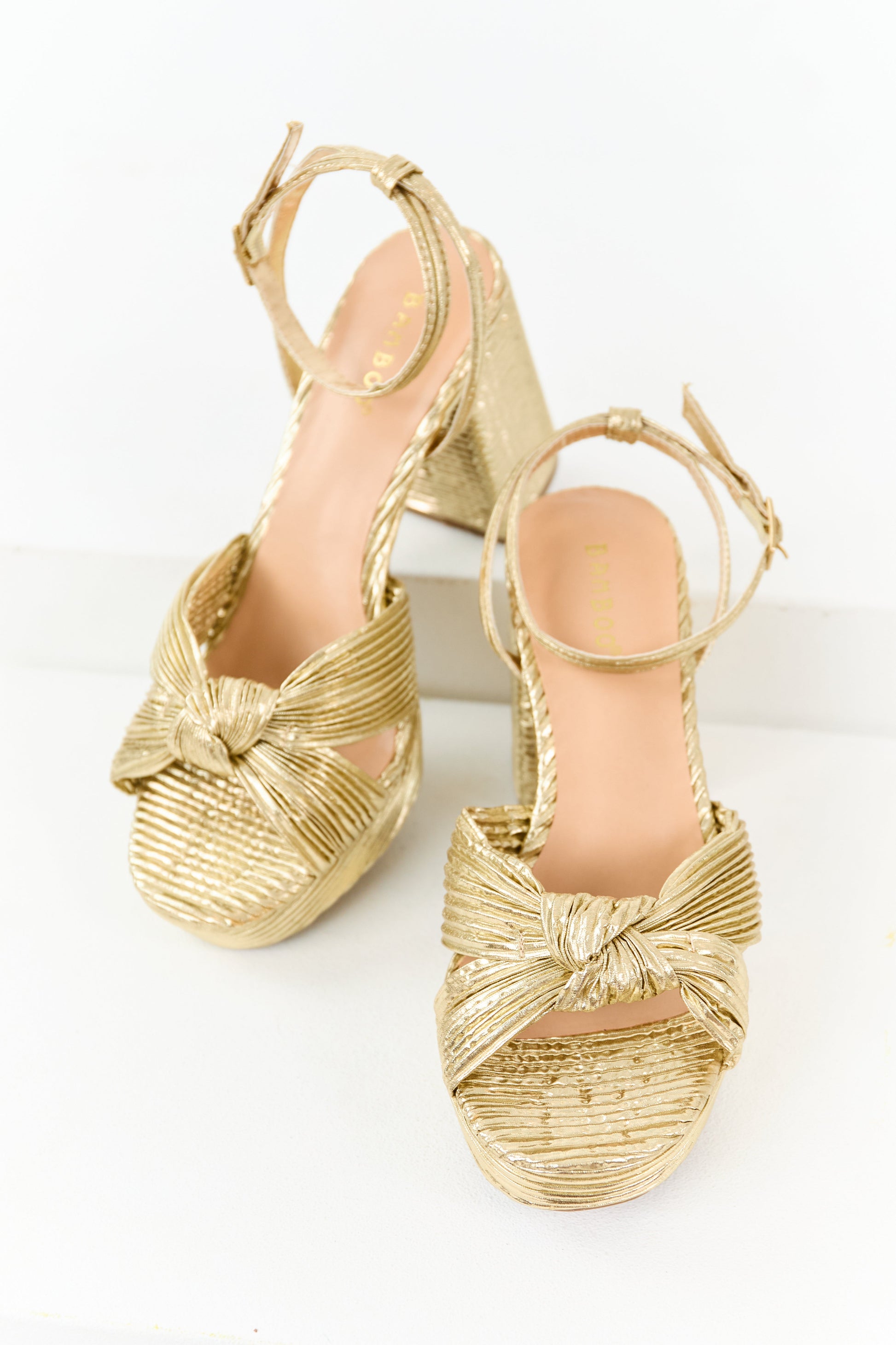 Gold Metallic Ribbed Knot Strap Platform Block Heels